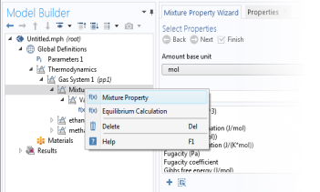 A Mixture Property is used to compute a property function that depends on the concentration of the species in a thermodynamic system. Some examples of the available property functions are density, enthalpy, heat capacity, and surface tension.