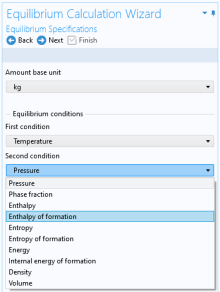 Select two Equilibrium conditions that define the current equilibrium, for example a given pressure and a temperature. These equilibrium conditions are used as arguments in the equilibrium functions, in addition to the composition (overall fractions of species).