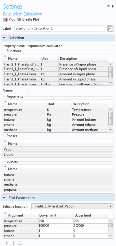 Selecting an Equilibrium Calculation node displays the settings including the property functions, see