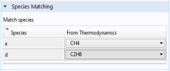 You can match the species in the Chemistry interface with those in the corresponding thermodynamic system in the Species matching section’s table. Use the lists in the column with the title
