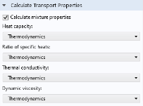 Chemistry interfaces can also be used to define transport properties for the resulting mixture (all species in the interface). When coupled, the following mixture properties can be automatically created: heat capacity, density, thermal conductivity, and dynamic viscosity.