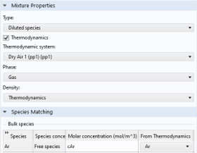 Mixture Properties section. Here you can match the variables for the concentrations, and by this calculate mixture properties (transport and thermodynamic properties). For information on how to specify the dependent variables to be used, see