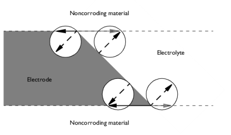 Figure 4-1: Gray/black arrows in whole stroke indicate the tangential electrode growth/dissolution velocities, vt, point, at the three-phase intersections between an electrolyte, a deposition/dissolution electrode and a noncorroding material. Dashed arrows are the growth/dissolution velocities, vcorr, based on the corrosion rate expressions. Note that the tangential velocities depend on both the angle between the corroding surface and the noncorroding surface, as well as the direction of the normal velocity.