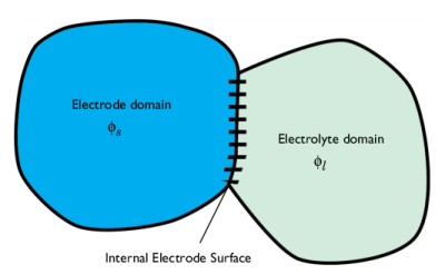 The node can be applied at interior boundaries between electrode and electrolyte domains, and to external boundaries of porous electrode domains. Note that, due to the high conductivity of many electrode materials, an Electrode domain can many times be replaced an external condition at the electrolyte boundary. For such cases, consider using the Electrode Surface instead.