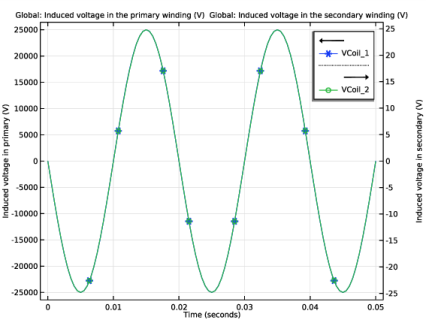 In the Settings window for Global, click Replace Expression in the upper-right corner of the y-Axis Data section. From the menu, choose Component 1 (comp1)>Magnetic Fields>Coil parameters>mf.VCoil_1 - Coil voltage - V.