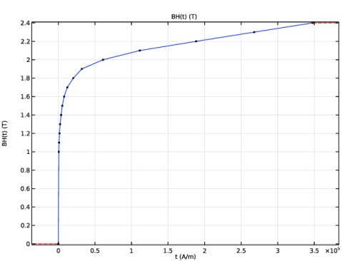 In the Model Builder window, expand the Component 1 (comp1)>Materials>Soft Iron (Without Losses) (mat2)>B-H Curve (BHCurve) node, then click Interpolation 1 (BH, BH_inv, BH_prim).