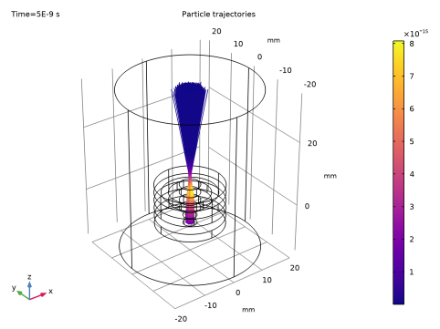 In the Model Builder window, expand the Results>Particle Trajectories (cpt)>Particle Trajectories 1 node, then click Particle Trajectories 1.
