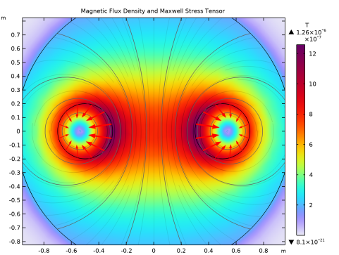 In the Settings window for Arrow Line, click Replace Expression in the upper-right corner of the Expression section. From the menu, choose Component 1 (comp1)>Magnetic Fields>Mechanical>mf.nToutx_wire2,mf.nTouty_wire2 - Maxwell surface stress tensor.