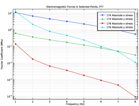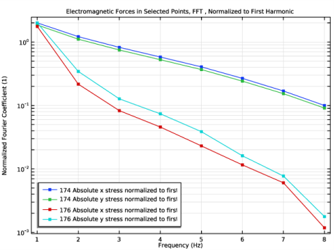 In the Model Builder window, expand the Electromagnetic Forces in Selected Points, FFT , Normalized to First Harmonic node, then click Point Graph 1.