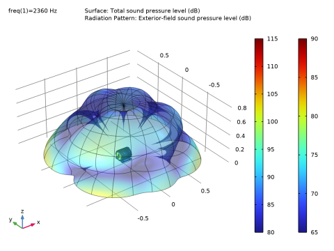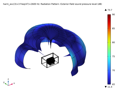 In the Model Builder window, expand the Results>Vibroacoustic Results - all Harmonics and Frequencies>Exterior-Field Sound Pressure Level (acpr) node.