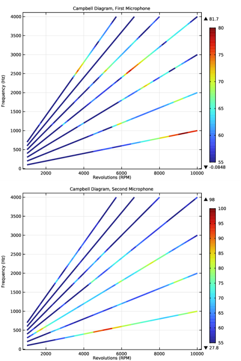 In the Model Builder window, expand the Results>Campbell Diagram, Second Microphone>Global 1 node, then click Color Expression 1.