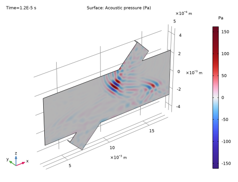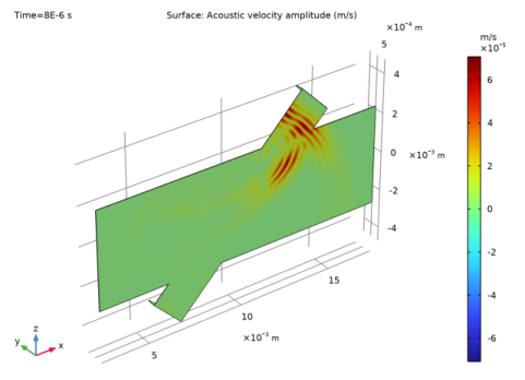 In the Settings window for Surface, click Replace Expression in the upper-right corner of the Expression section. From the menu, choose Component 1 (comp1)>Convected Wave Equation, Time Explicit>Acceleration and velocity>cwe.v_inst - Acoustic velocity amplitude - m/s.