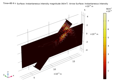 In the Settings window for Surface, click Replace Expression in the upper-right corner of the Expression section. From the menu, choose Component 1 (comp1)>Convected Wave Equation, Time Explicit>Intensity>cwe.Ii_mag - Instantaneous intensity magnitude - W/m².