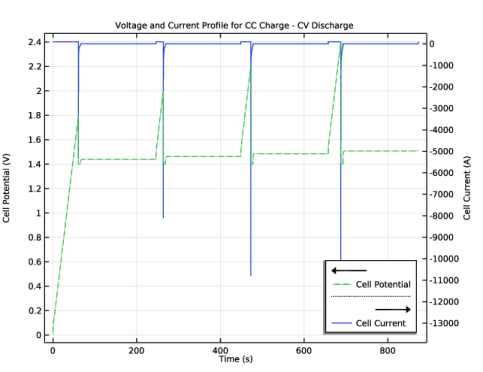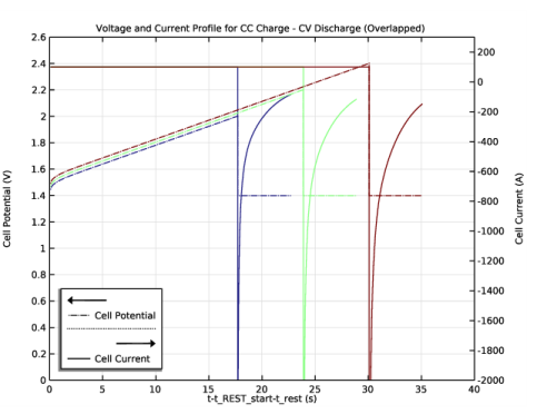 In the Model Builder window, under Results click Voltage and Current Profile for CC Charge - CV Discharge (Overlapped).