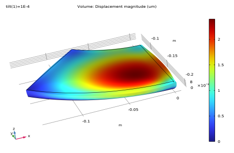 In the Settings window for Volume, click Replace Expression in the upper-right corner of the Expression section. From the menu, choose Component 1 (comp1)>Solid Mechanics>Displacement>solid.disp - Displacement magnitude - m.