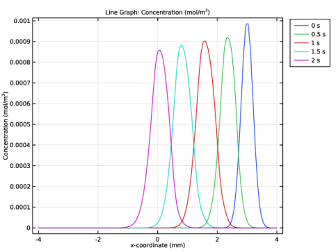In the Settings window for Line Graph, click Replace Expression in the upper-right corner of the y-Axis Data section. From the menu, choose Component 1 (comp1)>Transport of Diluted Species>Species c>c - Concentration - mol/m³.