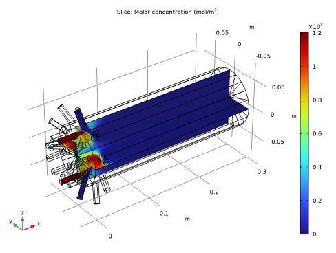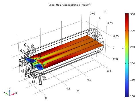 In the Settings window for Slice, click Replace Expression in the upper-right corner of the Expression section. From the menu, choose Component 1 (comp1)>Transport of Concentrated Species>Species wA>tcs.c_wA - Molar concentration - mol/m³.