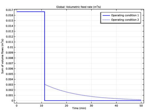 In the Settings window for Global, click Replace Expression in the upper-right corner of the y-Axis Data section. From the menu, choose Component 1 (comp1)>Reaction Engineering>re.sumvf - Sum of volume flows - m³/s.