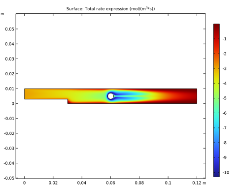 In the Settings window for Surface, click Replace Expression in the upper-right corner of the Expression section. From the menu, choose Component 1 (comp1)>Transport of Diluted Species>Species cA>tds.R_cA - Total rate expression - mol/(m³·s).