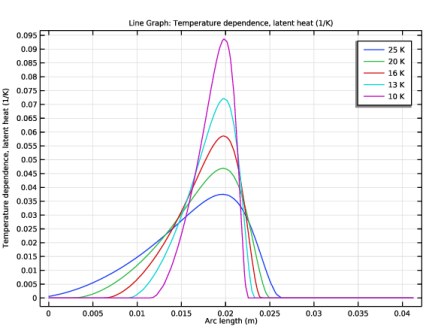 In the Settings window for Line Graph, click Replace Expression in the upper-right corner of the y-Axis Data section. From the menu, choose Component 1 (comp1)>Definitions>Variables>D - Temperature dependence, latent heat - 1/K.