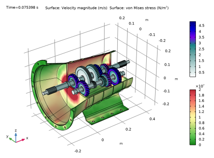 Figure 2: Distribution of von Mises stress in the housing at t = 0.0754 s. The speed of different gears is also shown.