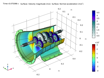 Additional information regarding the gear arrangements, loads, constraints, connections, boundary conditions for multibody and acoustics analyses can be found in the documentation for Modeling Vibration and Noise in a Gearbox.