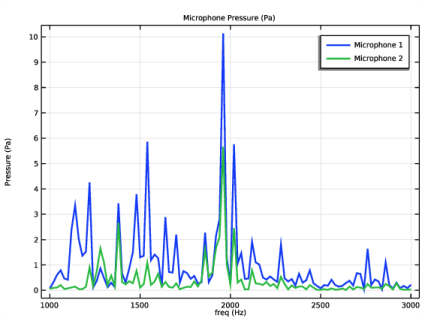 The pressure magnitude at two microphone locations as a function of frequency is shown in Figure 11. It can be seen that the magnitude of the pressure at microphone 1 is higher than the second one, since it is nearer to the source of noise.