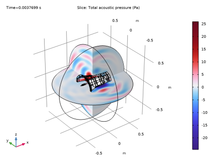 In order to visualize the pressure wave propagation in the air domain outside the gearbox, the frequency domain pressure data can be converted back to the time domain. The pressure field at a particular instance in time is shown in Figure 12.