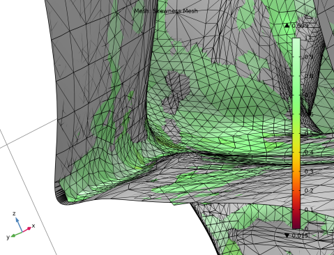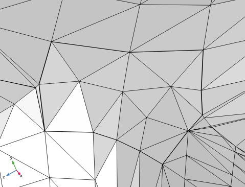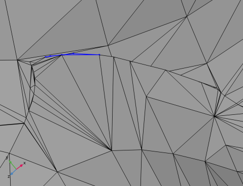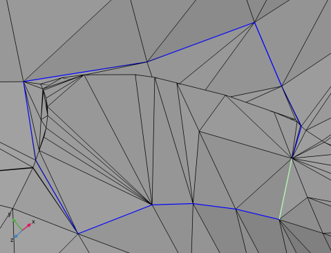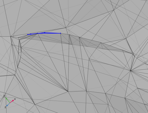 Select mesh edges around the fold by clicking them in the Graphics, similar to what is shown in the image below. The selection is most easily done with transparency off. If there are mesh edges on the opposite side of the view or are located inside a closed mesh face, it is recommended to use a Clip Plane or to hide boundaries in the mesh to reach those mesh edges. The selected edges can differ from the ones selected in the figure, as long as the edges form a closed loop, include the fold, and delimit only a small region around the fold. The last requirement is important when generating a new mesh face that follows the original mesh as close as possible.