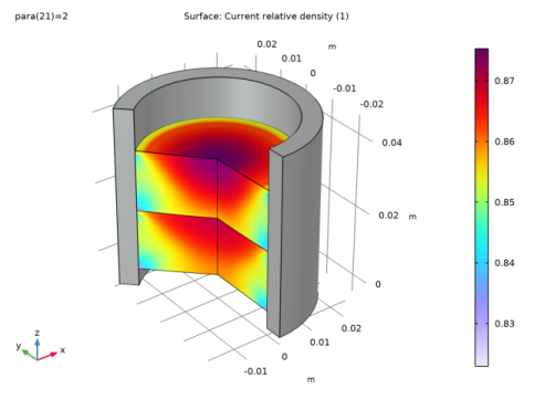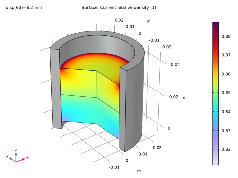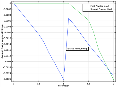 In the tree, select Study: Two-Stage Compaction/Solution 1 (sol1)>Solid Mechanics>Volumetric Plastic Strain (solid) and Study: Two-Stage Compaction/Solution 1 (sol1)>Solid Mechanics>Current Void Volume Fraction (solid).