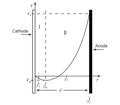 Compute the electric potential due to the space charge density of electrons in the diode, using a Stationary Solver. The boundary conditions for the Electrostatics interface are the specified potentials at the cathode and the anode.