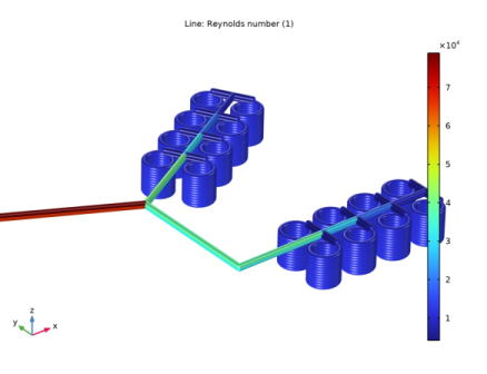 In the Settings window for Line, click Replace Expression in the upper-right corner of the Expression section. From the menu, choose Component 1 (comp1)>Nonisothermal Pipe Flow>nipfl.Re - Reynolds number.