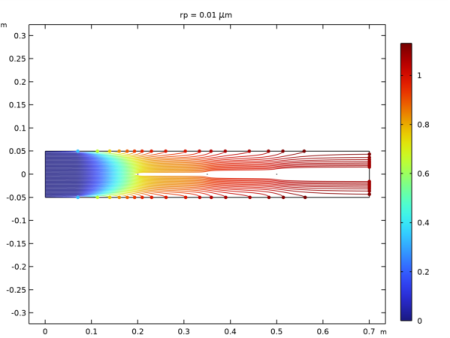 In the Model Builder window, expand the Particle Trajectories rp = 1e-8 m node, then click Particle Trajectories 1.