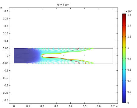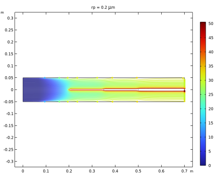 In the Model Builder window, expand the Results>Particle Trajectories rp = 2e-7 m>Particle Trajectories 1 node, then click Filter 1.