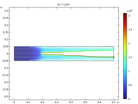 In the Model Builder window, expand the Results>Particle Trajectories rp = 2e-6 m>Particle Trajectories 1 node, then click Filter 1.