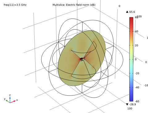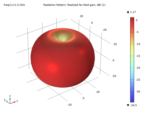 In the Settings window for Radiation Pattern, click Replace Expression in the upper-right corner of the Expression section. From the menu, choose Component 1 (comp1)>Electromagnetic Waves, Frequency Domain>Far field>emw.normdBEfar - Far-field norm, dB - dB.