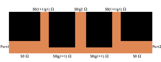 Scale the impedance of stubs by the reference characteristic impedance (50 Ω) and set the length of stubs to 0.125 wavelengths defined by the cutoff frequency.