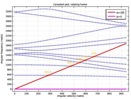 In the tree, select Study 1: Eigenfrequency/Parametric Solutions 1 (sol2)>Solid Rotor>Campbell Plot, Rotating Frame (rotsld).