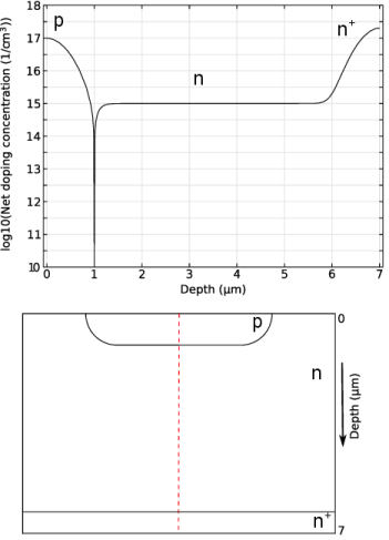 In the Model Builder window, under Component 1 (comp1) right-click Semiconductor (semi) and choose Doping>Analytic Doping Model.