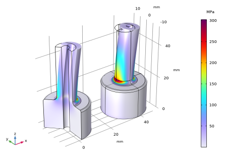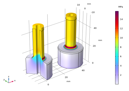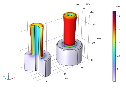 In the Model Builder window, expand the Results>Stress, 3D (solid) 1 node, then click Stress, 3D (solid) 1.