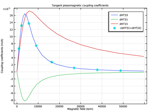 In the Settings window for Point Graph, click Replace Expression in the upper-right corner of the y-Axis Data section. From the menu, choose Component 1 (comp1)>Multiphysics>Effective properties>Tangent piezomagnetic coupling matrix, Voigt notation - m/A>npzm1.dHT33 - Tangent piezomagnetic coupling matrix, Voigt notation, 33-component.