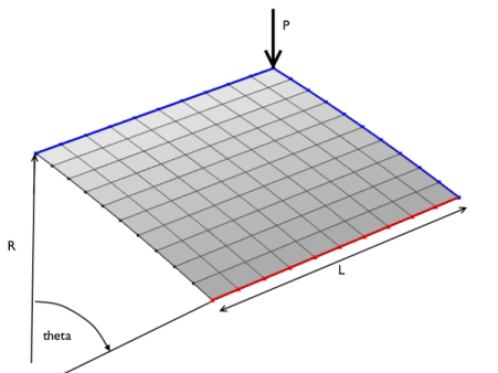 The radius of the cylinder is R = 2.54 m and all edges have a length of 2L = 0.508 m. The angular span of the panel is thus 0.2 radians. The panel thickness is th = 6.35 mm.