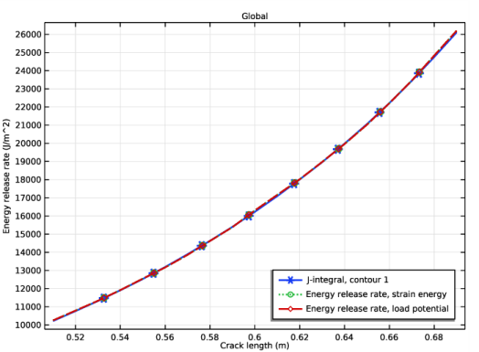In the Settings window for Global, click Replace Expression in the upper-right corner of the y-Axis Data section. From the menu, choose Component 1 (comp1)>Solid Mechanics>Cracks>solid.crack1.jint1.J - J-integral - J/m².