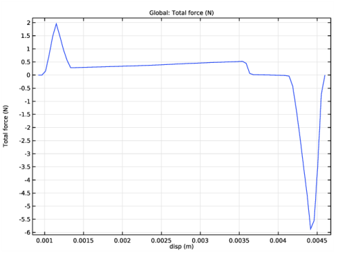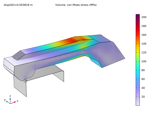 A prescribed displacement boundary condition is applied at the rightmost bottom surface of the hook. The displacement in the x direction is gradually changed by using the parametric solver; the other two displacement components are zero.