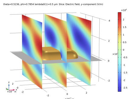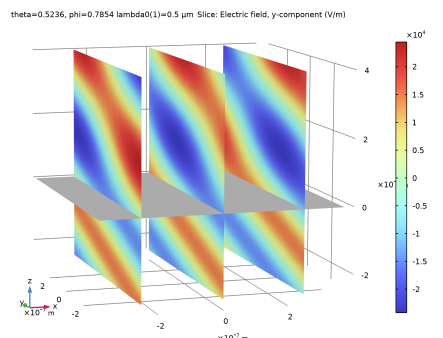 In the Settings window for Slice, click Replace Expression in the upper-right corner of the Expression section. From the menu, choose Component 1 (comp1)>Electromagnetic Waves, Frequency Domain>Electric>Electric field - V/m>ewfd.Ey - Electric field, y-component.