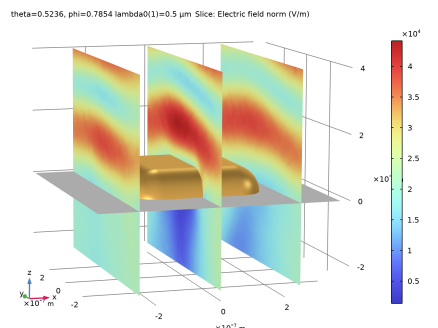 In the Settings window for Slice, click Replace Expression in the upper-right corner of the Expression section. From the menu, choose Component 1 (comp1)>Electromagnetic Waves, Frequency Domain 2>Electric>ewfd2.normE - Electric field norm - V/m.