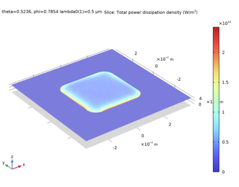 In the Settings window for Slice, click Replace Expression in the upper-right corner of the Expression section. From the menu, choose Component 1 (comp1)>Electromagnetic Waves, Frequency Domain 2>Heating and losses>ewfd2.Qh - Total power dissipation density - W/m³.