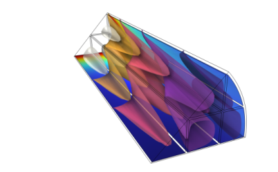 The temperature isosurfaces throughout a monolith reactor used in a catalytic converter. The surface plot shows the concentration profile of one of the reactants.