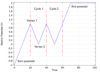 The Cyclic voltammetry setting varies the electric potential linearly in time as follows when used in conjunction with a Cyclic Voltammetry study step: