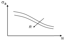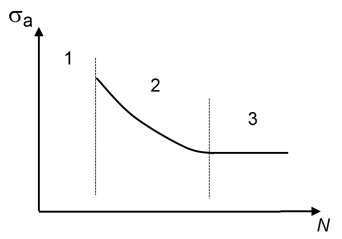 The S–N curve can be divided into three regions, shown in Figure 3-19. At high stresses, region 1, the fatigue life cannot be predicted since other mechanisms than the stress amplitude control fatigue. In this regime low-cycle fatigue and static failure can be expected. At intermediate stresses, region 2, the fatigue life is well defined and follows the S–N curve. At stresses below the endurance limit, the life is infinite and fatigue will not occur.